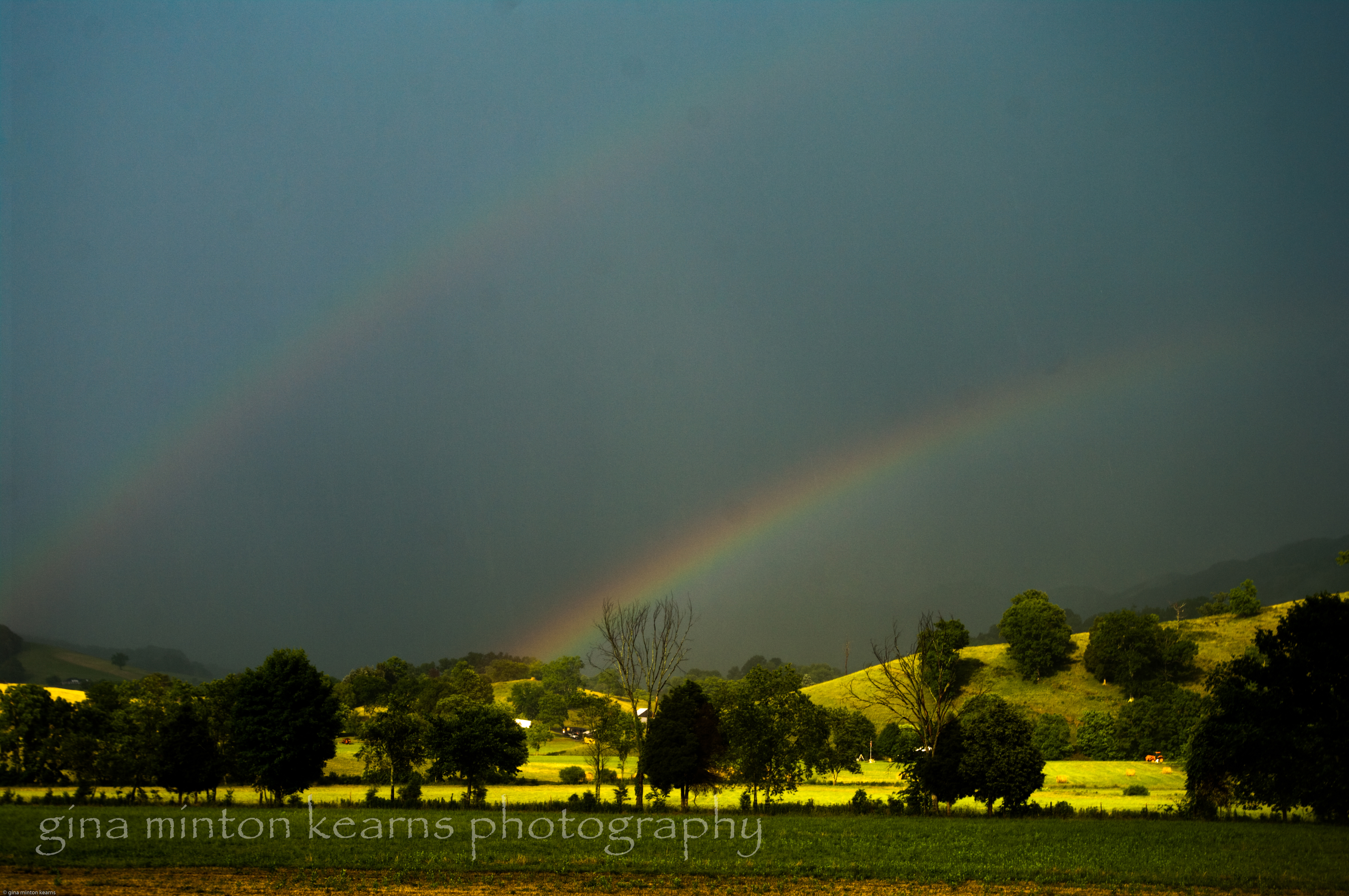 So immersed was I in the photographs, that I didn’t realize the weather had changed, the sun had hidden and it was coming an all-out storm… not, at least, until the power went off. The sky was dark, the lightening slashed straight and deadly from the sky and the rain pounded, also straight, diving into the dry dirt. As I watched it, noting the time, I changed to my wide angle lens, hoping that the sun would come out in time to make a rainbow. As I watched, the first rays began to shine through. I grabbed my Pentax, slid on my shoes and ran out into the rain. It was pouring and after only a couple of minutes, I was soaked, but I had to see. Then, there, before my eyes, the brilliant arcs of color began to form. I could tell already that, on foot, I would never make it to where I needed to be to get the entire arc. Turning, I ran through the rain, my camera around my neck, back to the house to get my car keys. Dripping wet and not caring less, I traipsed through the house to get the keys then barreled down the driveway to the place I had in mind, jumped out and started shooting. This day, I was blessed with many things. An entire day to myself, a phone call from my daughter, a trip through my mind back to Bays Mountain with my niece, a fine example of a summer thunderstorm, piercing lightening and, mayhaps most magnificent of all, a double rainbow. I always hope for blessings, but never cease to be amazed when I’m given one.